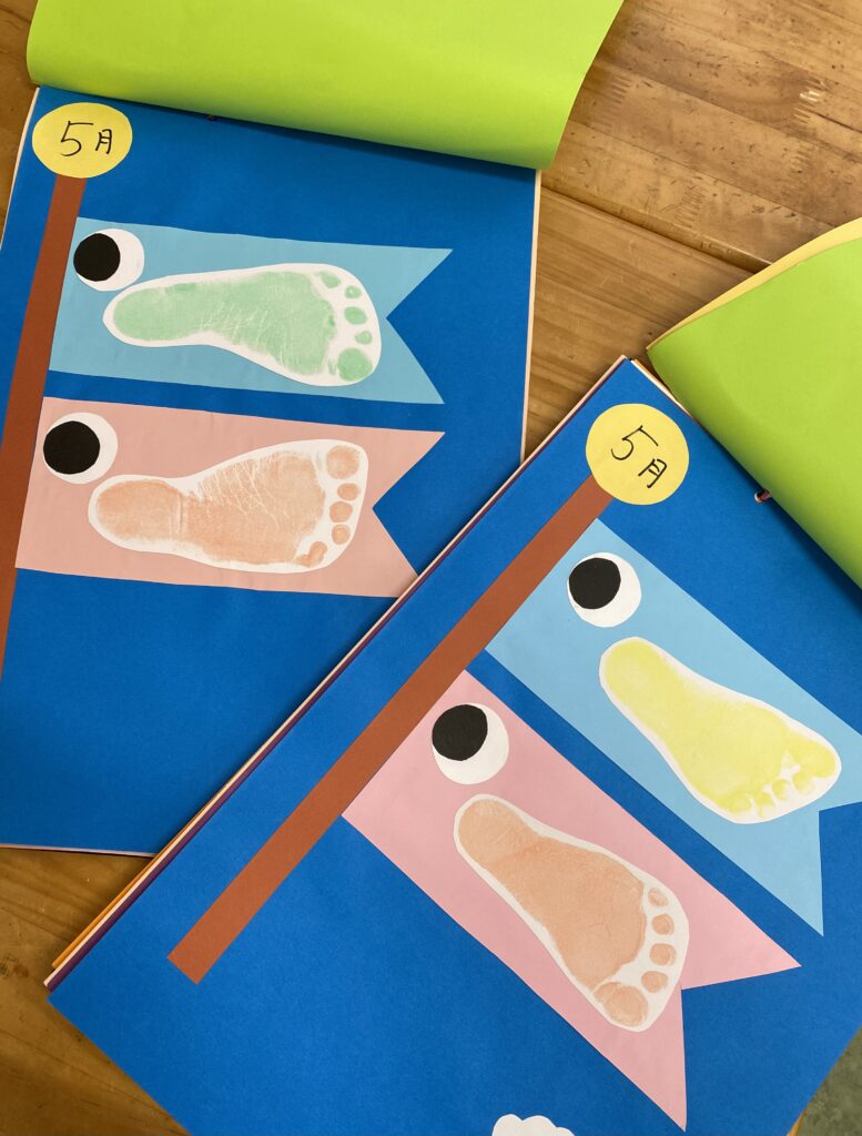 5月の「足形こいのぼり」では、少しずつ園生活にも慣れ、力強くスタンプを押す姿が見られました。