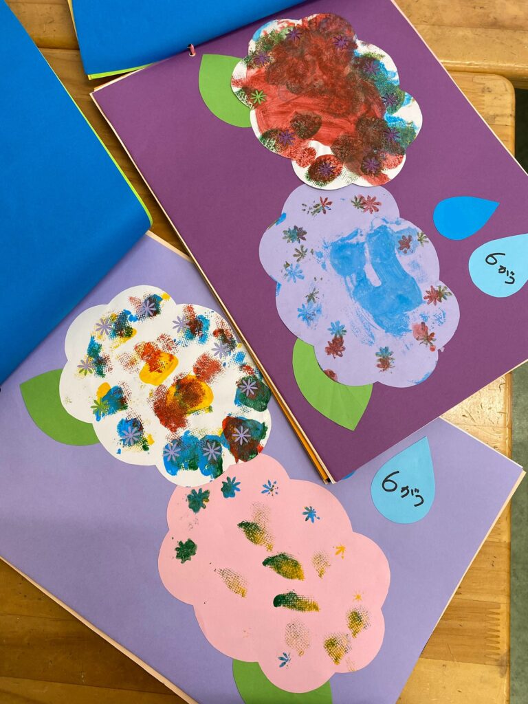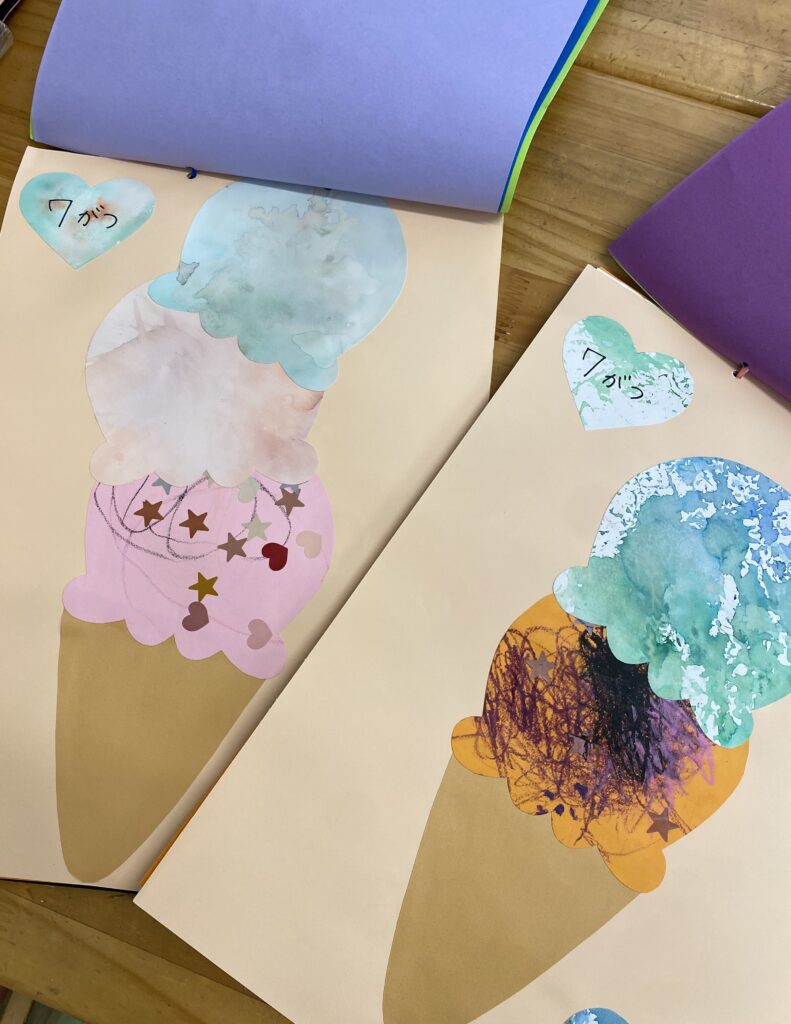 あじさいの製作では色の重なりを楽しみ、7月のアイスクリーム製作では「ちぎる」「貼る」といった少し細かい動作にも挑戦しています。