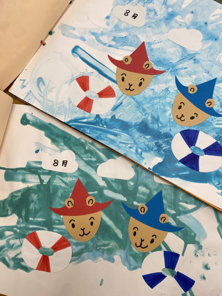 特に8月の「海」の製作では、大好きな絵本『ぐりとぐら』の世界をテーマにしました。